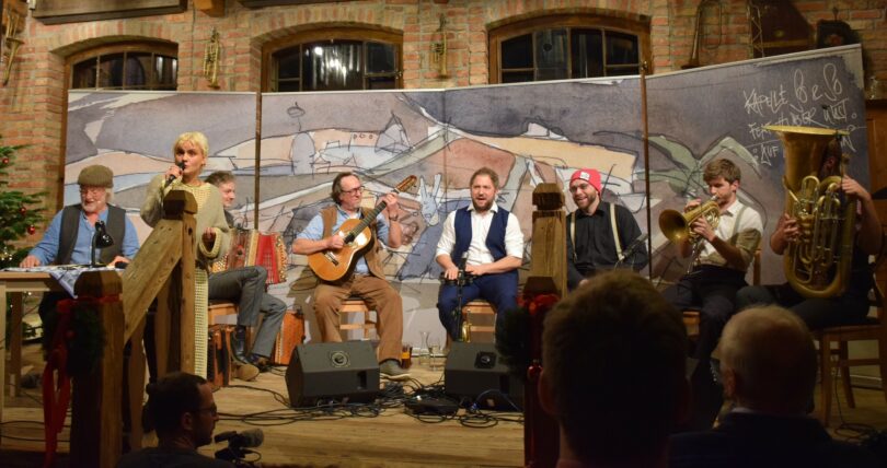 Bildunterschrift: Bei dem „Priener Kultur-Advent“ darf die Krippengeschichte natürlich nicht fehlen. Man mag sich gar nicht vorstellen, wie die Erzählung hätte ausgehen können, wenn sie nicht dabei gewesen wären, die Zwei… In der Kripperlgschicht „Auf Wiederkaun“ – musikalisch veredelt durch die Kapelle So&So – sind Ochs und Esel, ihrer Überzeugung nach, die Wichtigsten in der über zweitausend Jahre alten göttlichen Begebenheit zu Bethlehem. (v.l.n.r.) HuberWast, Josephine Huber, Hansi Auer, Michi Graf, Joschi Öttl, Wasti Höglauer, Manu Haitzmann und Stefan Huber.