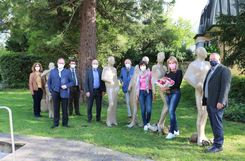 Foto: Prien Marketing GmbH: Auf zu Neuen Ufern – so lautet der Titel der Skulpturenreihe von Christa Biere, ausgestellt im kleinen Kurpark von Prien. Hier wurde Mitte Mai 2021 der Aufbruch in eine neue „Priener KunstZeit“ gefeiert. Coronabedingt fand die Eröffnung im kleinen Rahmen statt (v.l.n.r.) Die Priener Kulturreferentin Karina Dingler, der Erste Bürgermeister der Marktgemeinde Prien Andreas Friedrich, der Wirtschafts- Tourismus- und Digitalisierungsreferent Gunter Kraus, der zweite Bürgermeister Michael Anner, der Vorsitzende des Kulturfördervereins Dr. Friedrich von Daumiller, die Geschäftsführerin der Prien Marketing GmbH Andrea Hübner, die Kuratorin Inge Fricke und der dritte Bürgermeister Martin Aufenanger.