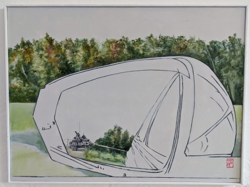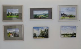 Erstmals hat Dr. Irmingard Weise den ehemaligen Kuhstall ihres Bauernhofs mit seiner fast ideal quadratischen Form und den 4 Säulen zu einer Galerie umfunktioniert. Die große Kunstliebhaberin führte mich bei meinem Besuch am letzten Ausstellungstag persönlich durch ihre Galerie. Auf der einen Seite des Ausstellungsraums waren die Bilder von Matthias Koeppel, der mit Öl auf Leinwand malt, auf der gegenüberliegenden Seite die Bilder von Sooki Koeppel, die Aquarell auf Büttenpapier oder auch Tusche auf Koreapapier bevorzugt. So entstand ein Stadt- Land Kontrast, aber auch eine Gegenüberstellung der Arbeitsweisen der beiden Künstler selbst und der von ihnen verwendeten Stile, nämlich des Realismus und des Neokubismus.