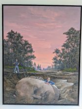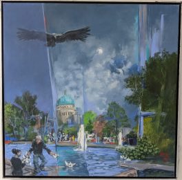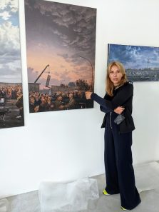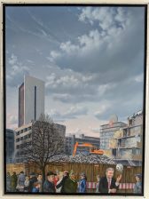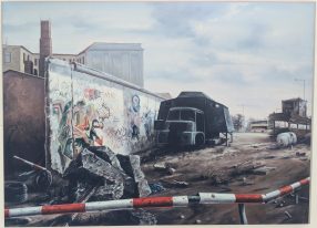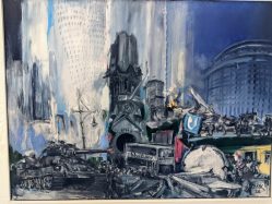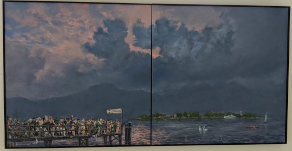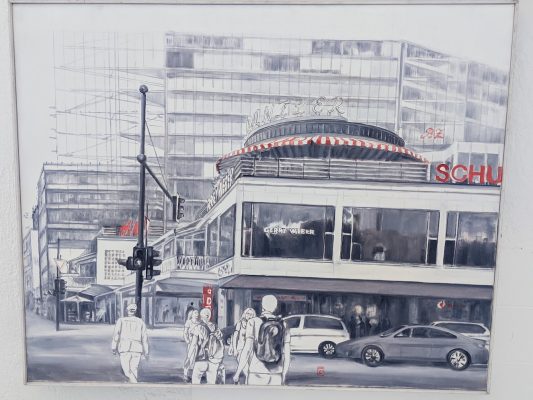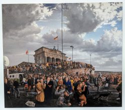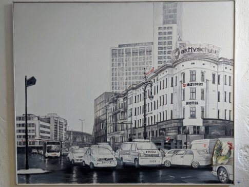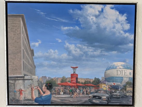 Die Motive sind ausgesprochen vielfältig. Wie mir die gerade anwesende Kuratorin der Priener „KunstZeit“ Ingrid Fricke erklärte, spiegeln die Berlin Bilder die aufregende Geschichte der Stadt wieder – so wird z.B. auch in verkleinerter Form ein Hauptwerk von Matthias Koeppel „Die Öffnung der Berliner Mauer“ gezeigt, dessen Original im Casino des Abgeordnetenhauses im Preußischen Landtag hängt. Die Kultur- und Kunsthistorikerin wies mich auch auf interessante Details in Matthias Koeppels Bildern hin, wie z.B. darin verborgene Prominente wie die Ex-Bundeskanzler Gerhard Schröder und Helmut Kohl, Ex-Berlin-Bürgermeister Klaus Wowereit, oder der frühere Fraktionsvorsitzende der Linksfraktion Gregor Gysi und versteckte Cola-Dosen als eine Art persönliches Kennzeichen.