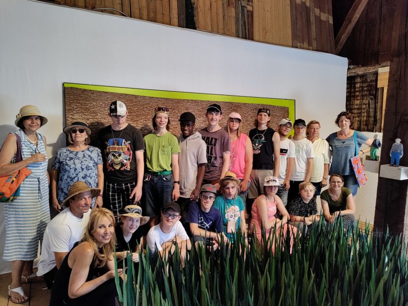 Ende Juli 2022 besuchten 22 junge Leute der Klara von Assisi Tagesstätte in Rosenheim die „Priener KunstZeit“. Zusammen mit ihren Begleiter:innen und geführt von der Kuratorin Ingrid Fricke entdeckten sie Kunstwerke an ungewöhnlichen Orten. Die Skulpturen „smile“ des Metallbildhauers Thomas Hans und „Nicht mit mir“ der Unterwössener Künstlerin Moni Stein fanden großes Interesse und persönliches Verständnis für die künstlerische Ausdrucksweise.