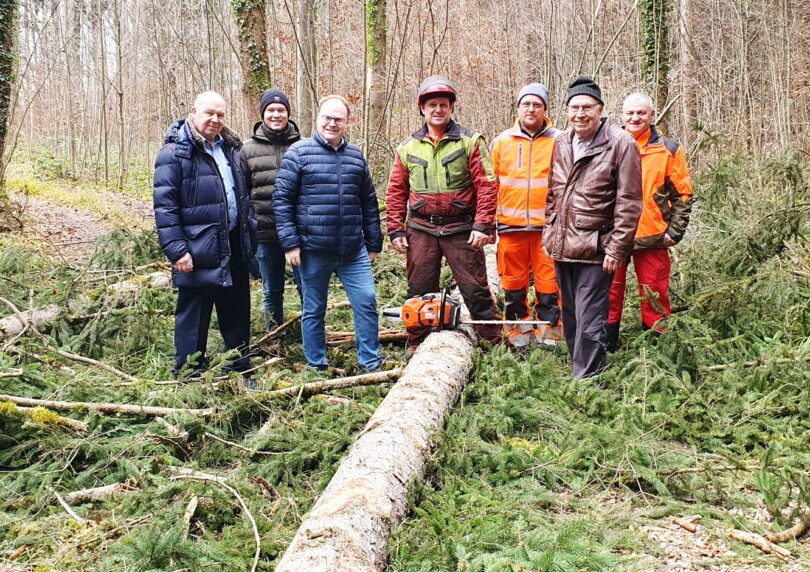 Foto: Kurz nach dem Fällen des Maibaumes mit den Spendern Michael Feßler (li.) und Ludwig Feßler (2. V.re.) und Bürgermeister Andreas Friedrich (3. V. li.).