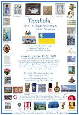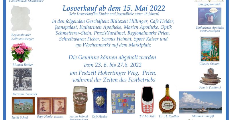 Eine Privatinitiative, bei der die Familie von Helga und Mathias Stampfl vielfach unterstützt wird, ist deren Tombola mit 1.800 Losen und 600 zum Teil sehr kostbaren Preisen zugunsten dem Haus „Leben mit Handicap“ und „Priener Ukraine-Hilfe“. Lose sind noch bei vielen Priener Geschäften zu erhalten, die Gewinn-Ausgabe erfolgt im Rahmen der Veranstaltungen beim Festzelt.