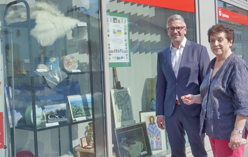 Foto: Stampfl – Helga Stampfl mit Sparkassen-Geschäftsstellenleiter Alexander Hagenbrock vor dem Fenster mit einem Teil der Tombola-Preise