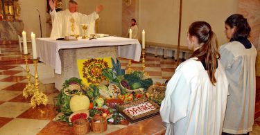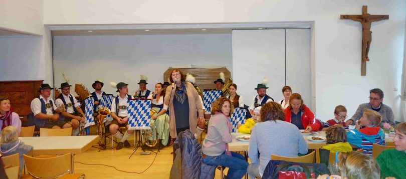 Ein Pfarrfest am Festtag Erntedank ist schon Tradition in Prien. Heuer musste aufgrund der naß-kalten Witterung nach dem Festgottesdienst in der Kirche auf die Pfarrheim-Räume ausgewichen werden. Dort standen eine gute Bewirtung – vom Chiemseer Fischfilet über die Ukraine-Spezialitäten Borschtsch (Eintopf) und Vareniki (mit Gemüse gefüllte Teigtaschen) bis zu Kaffee und Kuchen-Büffet – Weisen der Priener Blaskapelle unter der Leitung von Stefan Hackenberg und persönliche Gespräche im Mittelpunkt. Auch Pfarrvikar Gottfried Grengel, dessen Pfarrverbandes-Leitung ab 1. November zuvor in der Kirche verkündet wurde, nutzte die Gelegenheit der persönlichen Begegnungen. Pfarrgemeinderatsvorsitzende Regina Seipel hatte allen guten Grund den vielen Helferinnen und Helfern zu danken. Ihr besonderer Dank galt dem Festausschuss mit Rosi Hell, Barbara Huber, Hildegard Geisler, Marie-Luise Wimmer, Markus Kollmannsberger und Elisabeth Kotter. Sie sorgten mit ihren Vorbereitungen für unbeschwerte Pfarrfest-Stunden, dazu gehörte auch die Kinder- und Schmink-Betreuung der Katholischen Jugend im Raum der Kolpingfamilie.