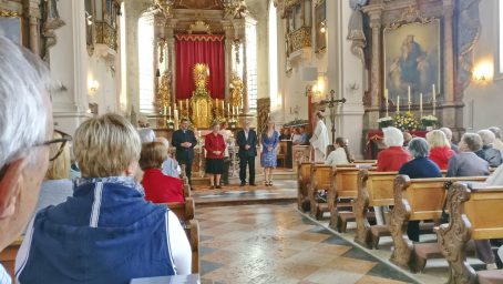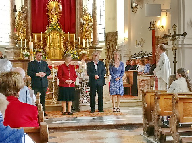 Im Rahmen eines Gottesdienstes in der Pfarrkirche „Maria Himmelfahrt“ in Prien wurden -von links- Gunther Kraus, Edda Eder, Fritz Seipel, Martina Rappel und (dienstlich abwesend) Elias Dreikorn aus ihrem bisherigen ehrenamtlichen Dienst im Team des Pfarrgemeinderates verabschiedet. Dabei dankten Pfarrer Klaus Hofstetter und Gemeindeleiter Werner Hoffmann mit Gottes Segen und mit Handschlag sowie mit Blumen und einer Dankurkunde.