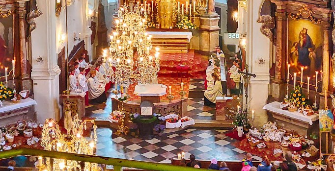 Zum Ende der Osternacht in der Priener Pfarrkirche “Maria Himmelfahrt” mischten sich erste Sonntags-Sonnenstrahlen in das von der österlichen Auferstehungsfreude erhellte Licht im Gotteshaus. Dabei kam es zu diesem Bild von der Chor-Empore, das den licht-durchfluteten Altarraum mit den für die Segnung mitgebrachten Oster-Speisen zeigt.