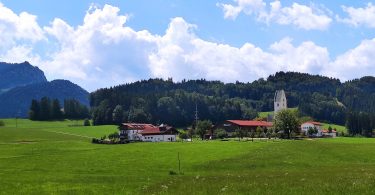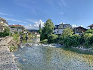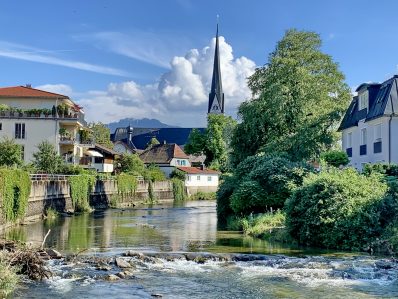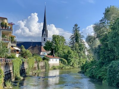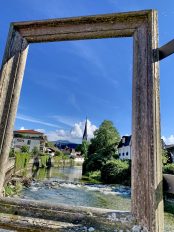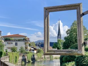 Prien wie gemalen und zum Teil auch gleich mit Rahmen – so kann man das Herz der Marktgemeinde mit der Pfarrkirche “Maria Himmelfahrt” vom Ufer des Flusses Prien betrachten, wenn man sich auf einem Platz zwischen dem Priener Friedhof und dem Priener Ortsteil Am Gries befindet. Der Blick durch den am Wegrand angebrachten Rahmen erinnert unter anderem daran, dass Prien und der Chiemsee gerne aufgesuchte Plätze für Maler und Künstler waren und sind.