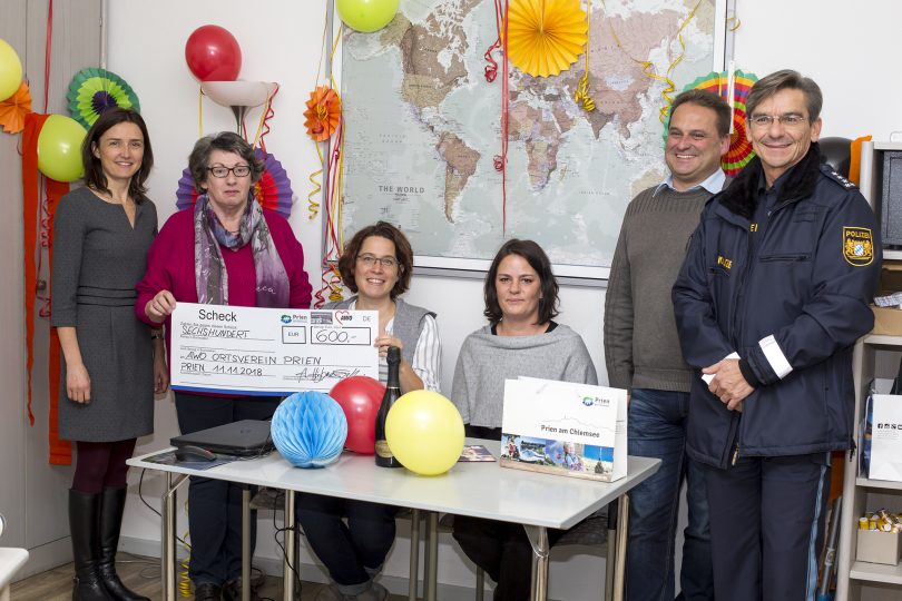 Bereits seit fünf Jahren veranstalten die PriMa und die benachbarte PI mit Unterstützung der ChiMa am Unsinnigen Donnerstag ein gemeinsames Fest zur närrischen Zeit. So herrschte auch am Donnerstag, 8. Februar 2018 ein buntes Treiben im „Priener Zirkuszelt“ – und alles für den guten Zweck! Viele Artisten, Seiltänzerinnen, vor Kraft strotzende Muskelprotze, Raubtier-Dompteure und exotische Zweibeiner der drei Organisationen vollführten ihre Kunststückchen in der Manege im Foyer des Chiemsee Saals, während die Zuschauer mit ihrem Konsum an allerlei Getränken einen Spendenbetrag von 600 Euro erzielten. Am Montag, 26. November 2018 überreichten die Geschäftsführerin der PriMa Andrea Hübner und Polizeihauptkommissar Dieter Bezold im Beisein der drei Veranstaltungsleiter einen symbolischen Scheck an Elke Flender-Back, Vorsitzende des AWO-Ortsvereins Prien e. V.. Der AWO-Verband unterstützt Menschen in Not und bietet Hilfe auf jeder Ebene. Die Grundwerte der AWO Solidarität, Toleranz, Freiheit, Gleichheit und Gerechtigkeit sind Ausgangspunkt der überwiegend ehrenamtlichen Arbeit. Die Spendensumme von 600 Euro kommt „eins zu eins“ hilfesuchenden und benachteiligten Prienerinnen und Prienern zugute um deren Lebenssituation zu verbessern.