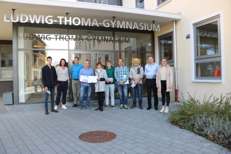 Bildunterschrift: Die Geschäftsführerin der Prien Marketing GmbH Andrea Hübner (fünfte von links) und die Projektleiterin des „Stadtradelns“ Magdalena Berka (zehnte von links) zeichneten die erfolgreichsten Priener Radler:innen aus: Gabriel Anton Aiblinger Izquier (bester Schüler), Kristina Reicheneder und Nikolaus Vogel von der Umwelt-AG, Winfried Kober (Stellvertreter des Radvereins 1893 Prien e.V.), Niklas Schramm (Sohn vom besten Elternteil), Albert Eichner (Stellvertreter des besten Familien-Teams), Michael Herden (bester Lehrer) und der Schuldirektor des Ludwig-Thoma-Gymnasiums Andreas Schaller, dem für die weiteste Anreise aus Rosenheim ein „Ehren-Gutschein“ überreicht wurde.