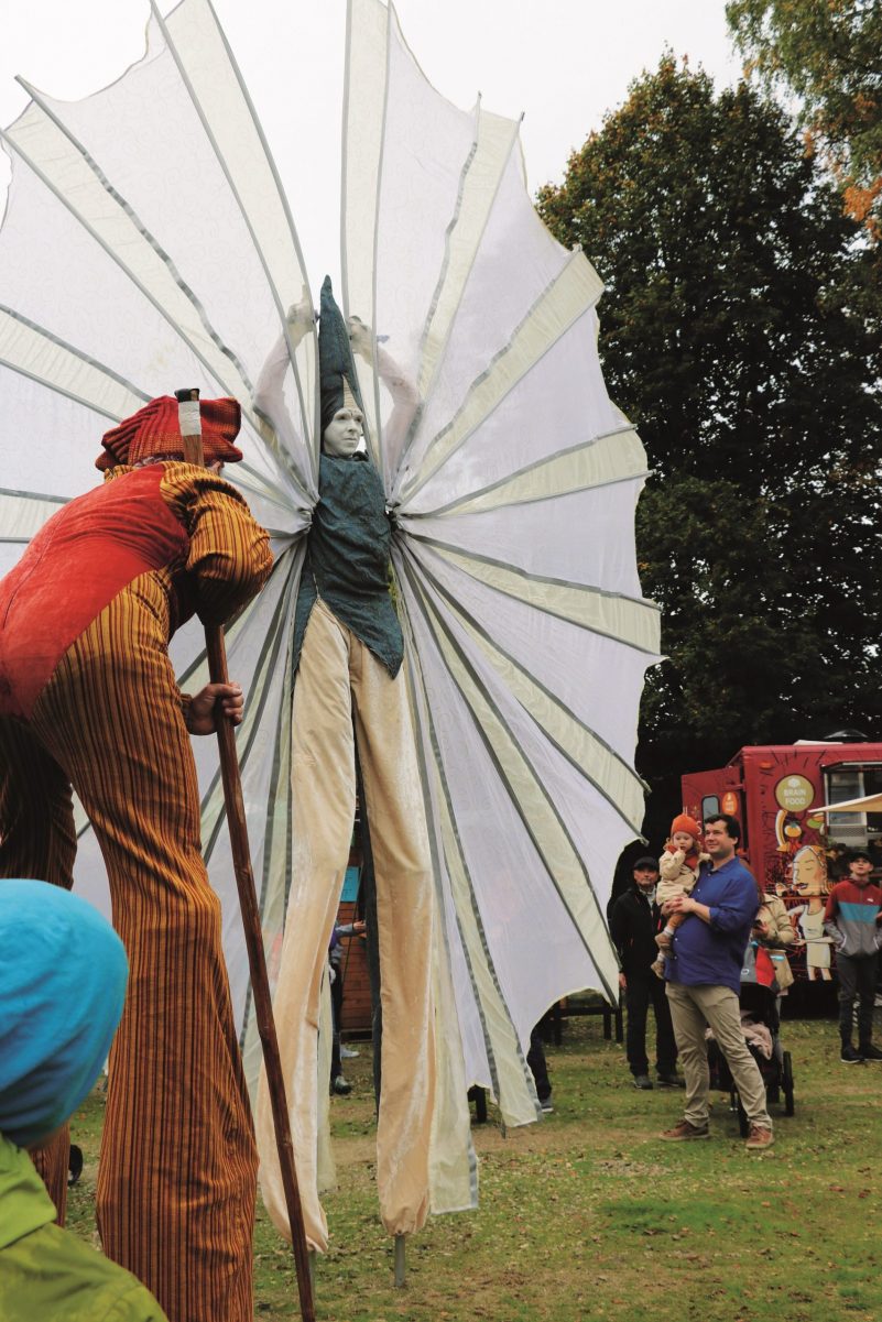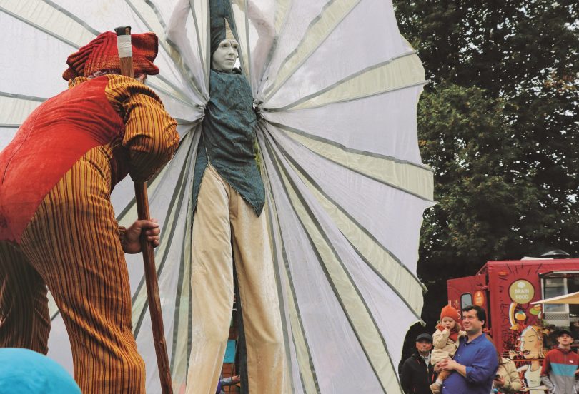 Foto: Prien Marketing GmbH – Verkleidet als fantastische Hochstelzenfiguren begeisterten die beiden Straßenkünstler Emmeran Herringer und Stefan Pillokat 2019 das Priener Publikum.