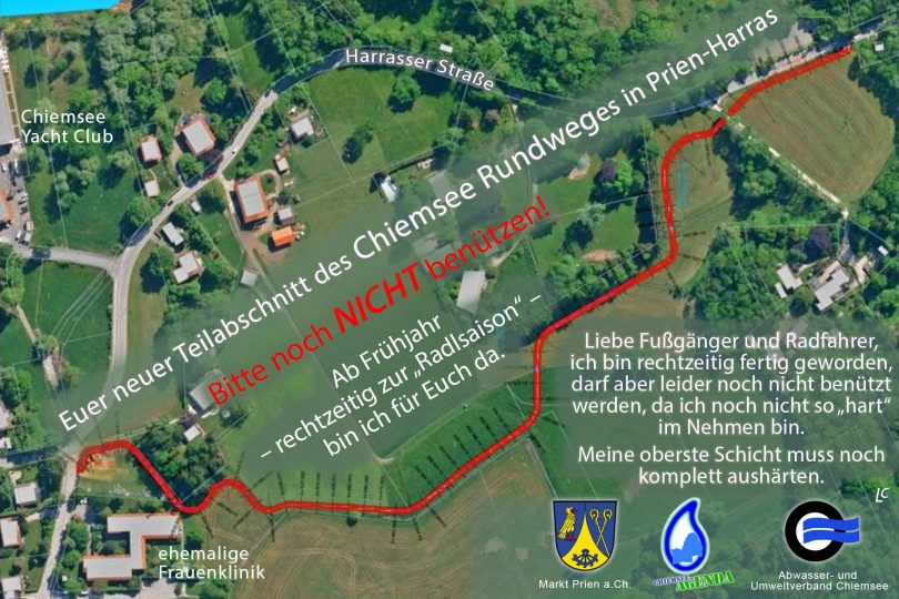 Gemeinsam ist es dem Markt Prien sowie dem Abwasser- und Umweltverband Chiemsee gelungen, im Priener Ortsteil Harras ein wichtiges Teilstück des Chiemsee-Ufer-Radweges abseits der Hauptverkehrsstraßen zu erstellen. Nunmehr ist dieser Weg baulich erstellt, er kann aber noch nicht benützt werden, da die oberste Schicht noch erhärten muss. Rechtzeitig zum Beginn der Radl-Saison im Frühjahr wird es dann soweit sein, dass die Radler den neuen Streckenabschnitt in Harras nutzen können.