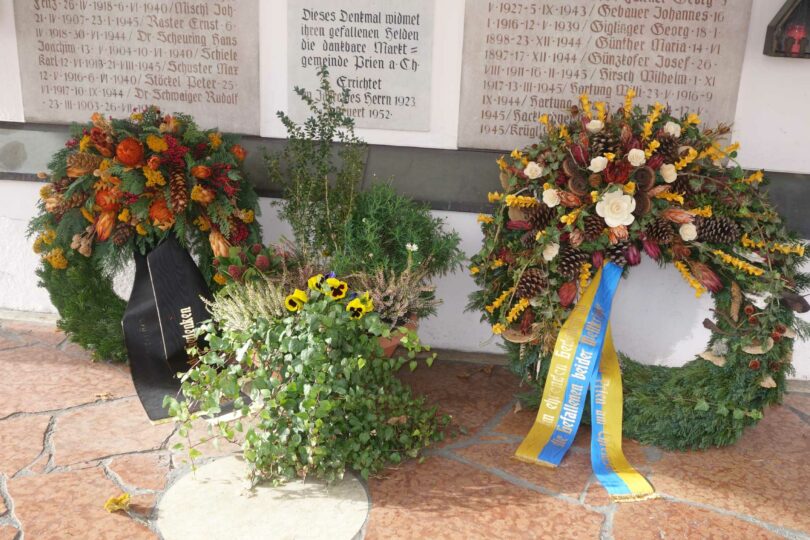 In diesem Sinne und als äußeres Zeichen lege ich mit meinen beiden Gemeinderats-Kollegen Ludwig Ziereis und Michael Voggenauer für den Markt Prien einen Kranz am Kriegerdenkmal nieder.