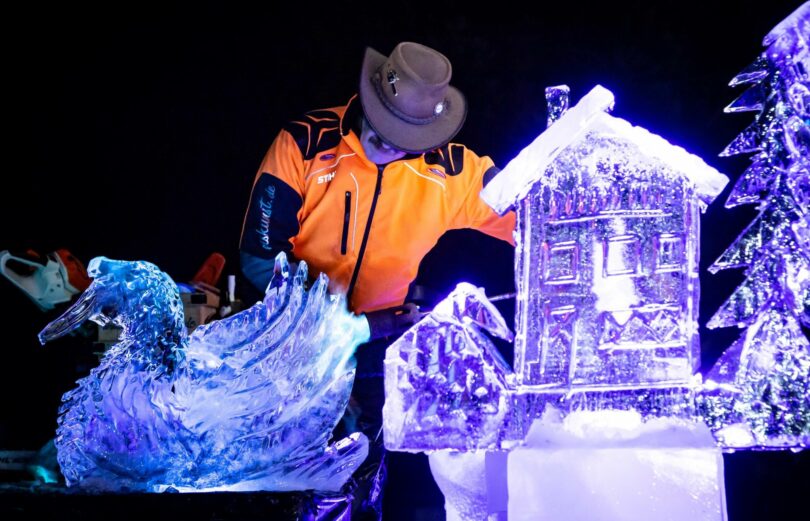 Bild: Während der Vorsilvesterparty an der Kunsteisfläche lässt der Eiskünstler Christian Staber aus Eisblöcken faszinierende Skulpturen entstehen.