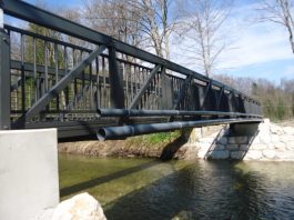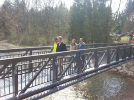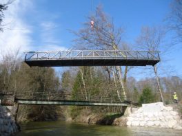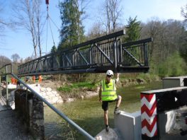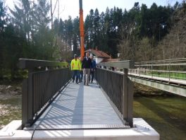 Frohe Nachricht für Wanderfreunde in Prien: die Fußgängerbrücke über die Prien nahe des E-Werks bei Grabelmühle wird derzeit von der Marktgemeinde Prien erneuert. Das in die Jahre gekommene Bauwerk ist Bestandteil eines beliebten Wanderwegs im Priental und ersetzt die bisherige Brücke, die Ende April mit Fertigstellung der neuen Brücke abgebaut werden wird. In diesen Tagen wurde der 19 Meter lange, 1,80 Meter breite und 4,06 Tonnen schwere Überbau mit einem großen Kran in Position gebracht. Die Baumaßnahme war notwendig, weil bei der letzten Bauwerksprüfung im Jahr 2014 festgestellt wurde, dass sich der Fußgängersteg in einem baulich schlechten Zustand befindet, insbesondere die Widerlager und die Betonbauteile wiesen erhebliche Mängel auf. Aufgrund der Bedeutung des Wanderwegs für den Kur- und Ferienort Prien sowie für die einheimische Bevölkerung entschloss sich der Gemeinderat, die neue Brücke flussaufwärts neben der alten Brücke zu errichten und im Haushalt hierfür Bau-, Planungs- und Ingenieur-Kosten in Höhe von insgesamt 223.000 Euro bereitzustellen. Dem imposanten Einbau der Fachwerktrogbrücke aus stranggepressten Aluminiumprofilen als Fertigteil wohnten unter anderem auch Bürgermeister Jürgen Seifert und Andreas Gasteiger als der vom gemeindlichen Bauamt zuständige Projektbetreuer bei. Sie zeigten sich begeistert von der Umsetzung der Pläne und von den Arbeiten, unter anderem als die Betonauflagerbalken auf den zur Gründung dienenden Mikrobetonbohrpfählen exakt aufgesetzt wurden. „Mit diesem Brückenbauwerk leisten wir einen schönen Beitrag für das wanderbare Prien“, so Bürgermeister Jürgen Seifert zu der Baumaßnahme, die Ende April mit den Auffüll- und Planierarbeiten zu Ende geht.