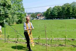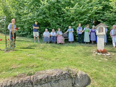 „Ich bin der Weinstock, Ihr seid die Reben“ – gemäß diesem Zitat aus der Heiligen Schrift blickte Pfarrer Hofstetter wenige Wochen vor seinem Abschied nach sieben Jahren seelsorgerischer Tätigkeit in Prien und Umgebung zurück und sagte: „Als ich vor sechs Jahren hier heroben eine Mai-Andacht feiern durfte, war ich überrascht, dass es hier im Chiemgau einen Weinberg gibt. Dankbar bin ich für viele Begegnungen, so möge auch dieser Weinberg reiche Frucht bringen“. Als ehemaliger Weinerntehelfer in der Studentenzeit und in der Toskana gab Pfarrer Hofstetter noch folgende Empfehlung: „Bei wohl bereitetem Boden, bei guter Pflege, mit genügend Wasser und nicht zu viel Dünger sowie mit der notwendigen Geduld wird das Werk gelingen. Bedenken wir dabei immer, dass wir die Schöpfung bewahren, aber sie uns nicht untertan machen, denn wir sind Teil dieser Schöpfung“. Die feierliche Andacht mit Segnung des Weinbergs mit einem Bildstock des Heiligen Urban wurde von Michaela Leidel mit Harmonika sowie von Mitgliedern des Frauensingkreises Hittenkirchen musikalisch gestaltet. Christian Steinbichler, der zusammen mit Gisela Wüstinger und Markus Pfeuffer die Hauptorganisation der Neubepflanzung übernommen hatte, erinnerte, dass in den bisherigen Weinberg-Jahren die Ernten ganz und gar unterschiedlich ausfielen. „Die Erstbepflanzung erfolgte mit den Intensiv-Sorten Silvaner und Müller-Thurgau, das bedeutete auch einen hohen Pflanzenschutz-Einsatz. Dieses mal gehen wir mit den Sorten Johanniter, Solaris und Bianca (weiß) sowie Nero (rot) und noch weiteren Sorten einen anderen Weg. Diese pilzwiderstandsfähigeren Sorten haben wir in enger Abstimmung mit Fachleuten und mit dem Verein PIWI International ausgewählt“.