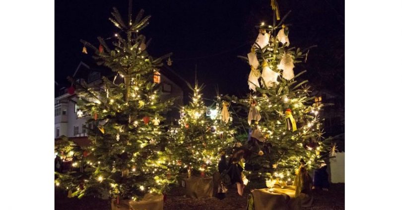 Bildrechte: Anita Berger – Bildunterschrift: Jeder Baum ist einzigartig und wurde von den Kindern des Caritas-Kinderhorts Wirbelwind, allen Gruppen des katholischen Kindergartens St. Irmengard, der Kampenwand-Schule, der 4. Klasse der Franziska-Hager-Grundschule, der 6. Klasse der Kommunalen Realschule Prien, der 5a, 6d und 9c der Staatlichen Realschule Prien, der 6d und 7d des Ludwig-Thoma-Gymnasiums Prien und PrienaYou liebevoll geschmückt.