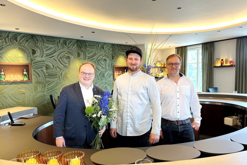 2. Foto: Das Restaurant „Zum Fischer am See“ hat einen „Bib Gourmand“ erhalten: (v.l.n.r.) Der Fachbereichsleiter für Tourismus, Kultur und Wirtschaftsförderung Tobi Huber und der Erste Bürgermeister der Marktgemeinde Andreas Friedrich gratulieren Oliver Leyk (im Bild mittig) zu dem Michelin-Gütesiegel.