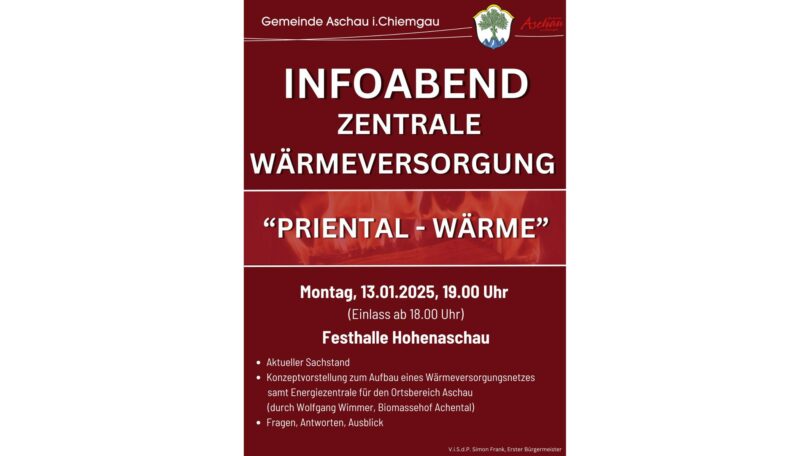 Die Gemeinde Aschau lädt herzlich ein zum Infoabend „Zentrale Wärmeversorgung in Aschau“ am Montag, 13.1.2025 um 19:00 Uhr (Einlass ab 18:00) in die Festhalle Hohenaschau.