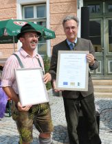 Das Weiterbestehen des Prientaler Bergbauernladens am Bahnhof in Aschau ist für die kommenden zehn Jahre gesichert. Bürgermeister Peter Solnar überreichte dem Geschäftsführer Sebastian Pertl beim großen Jubiläumsfest eine Verlängerung des Nutzungsvertrages bis zum Mai 2029. Die zahlreichen Festgäste – unter ihnen auch die beiden Landtagsabgeordneten Klaus Stöttner und Otto Lederer, die stellvertretende Landrätin von Rosenheim Marianne Loferer, Bezirksrat Sebastian Friesinger und weitere aktive und bereits ausgeschiedene Mandatsträger aller Ebenen, die gerade von der Bergmesse auf der Kampenwand kamen – applaudierten und brachten auch dadurch zum Ausdruck, wie sehr sich die Aschauer an ihren Bauernladen gewöhnt haben. Zusätzlich brachte Bürgermeister Solnar auch noch Geld aus einem Leader-Projekt mit ins Festzelt auf dem Hans-Clarin-Platz: Rund 6500 Euro erhielt der Bergbauernladen für die Beschaffung eines Automaten, der an 365 Tagen rund um die Uhr die Versorgung der Bevölkerung mit frischen Bio-Lebensmitteln aus der Region sicherstellt. Insgesamt musste der Bergbauernladen fast 26000 Euro für diesen Verkaufsautomaten vor dem Laden aufbringen. Obwohl der Laden zum Jubiläum den ganzen Tag geöffnet war, ließen es sich viele nicht nehmen, bereits probehalber einmal am Automaten einzukaufen. Auch der Landtagsabgeordnete Klaus Stöttner ließ sich von Sebastian Pertl in die Bedienung des Automaten einweisen, der mit über 50 Einzelangeboten an Getränken, Milch, Käse, Wurst, Fleisch und Eiern aus der Region alles enthält, was man so braucht. Das gesamte Angebot stammt von den Biobauern aus der Region, die sich im Aschauer Bergbauernladen zusammen gefunden haben. Mit diesem Angebot schließt der Bergbauernladen eine wichtige Angebotslücke, konnten die Besucher doch bisher nur zu den Öffnungszeiten am Freitag einkaufen.