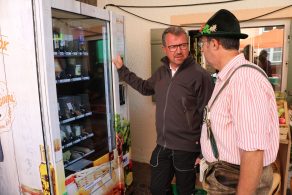 Stolz führt Geschäftsführer Sebastian Pertl dem Landtagsabgeordneten Klaus Stöttner den neuen Automaten vor, der an 365 Tagen rund um die Uhr die Versorgung der Bevölkerung mit frischen Bio-Lebensmitteln aus der Region sicherstellt.