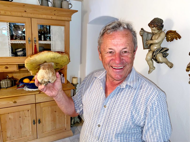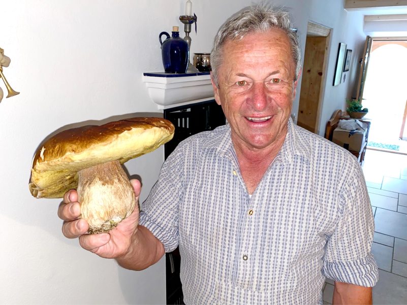 Da traute der routinierte Schwammerlsucher Erich Gawlik aus Aschau i. Chiemgau seinen Augen nicht: als er in diesen Spät-Oktobertagen im Hofalmgebiet unterwegs war, rechnete er aufgrund der abgeklungenen Schwammerl-Saison nicht mit einem Steinpilz. „Es war heuer eine gute Zeit für Pilzsucher, auch Steinpilze gab es einige Zeit reichlich, aber so ein großes Exemplar habe ich noch nie in Händen gehabt“ – so der Prientaler Glückspilz, der das Riesenexemplar mit einem Gewicht von 1,1 Kilogramm und mit einem Kappendurchmesser von 23 cm halbierte und für zwei Mahlzeiten einteilte. Der Steinpilz war nämlich ohne jeden Makel und Wurm, sein Fleisch – so der Finder – war schneeweiß.