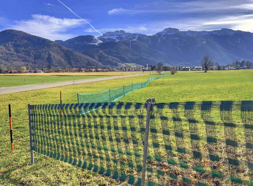 Kilometerweise steht er meist neben den Straßen und es wird ihm wenig Beachtung geschenkt, der Schneezaun. Schon im Herbst wird der Schneezaun in der ganzen Region aufgebaut um gerüstet zu sein, wenn die weiße Pracht Einzug hält. Doch in diesem Jahr ist er noch nicht groß zum Einsatz gekommen und schlummert so fest verankert regelrecht im Winterschlaf. Seit vielen Jahrzehnten hat sich das grüne Geflecht als ein wirkungsvolles Mittel behauptet, um Schneeverwehungen zu reduzieren. Doch schaut man den Schneezaun wie hier bei Aschau i.Chiemgau gerade jetzt bei der frühlingshaften Stimmung mal bewusst an, so könnte man diesen auch direkt als Kunstwerk in der Landschaft wahrnehmen.