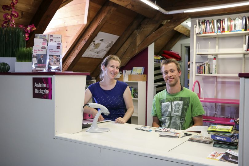 Bildunterschrift: Wertvolle und lehrreiche Erfahrungen sammelte Lucas Huber (rechts) in seiner Praktikumswoche bei der Prien Marketing GmbH, bei der er der Büchereileiterin Bernadette Binder (links) und den Mitarbeiterinnen der Bücherei Prien unter die Arme griff.