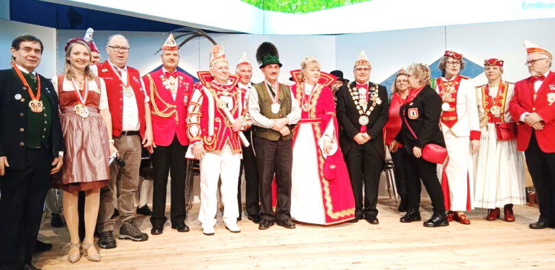 Folglich gab sich das derzeit regierende Prinzenpaar der Stadt Berlin die Ehre, den Bayern auf der Internationalen Grünen Woche einen Besuch abzustatten. Auf der Bühne der Bayernhalle begrüßte Moderatorin Marion Schmieg seine Tollität Prinz Klaus II. und ihre Lieblichkeit Prinzessin Marion I. mit ihrem Gefolge auf das Herzlichste. Mit dabei die Präsidentin der Berliner Prinzengarde, Christiane Holm, der Präsident des Festkomitees Berliner Karneval, Klaus-Peter Heimann und der 1. Vorsitzende des Vereins der Bayern in Berlin, Helmut Amberger, der auch als Gardeoffizier in der Prinzengarde seinen Dienst tut.