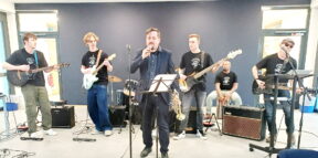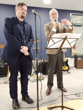 Bericht und Fotos: Christiane Giesen – Professor Dr. Roland Kaehlbrandt (rechts) neben Deutschlehrer und Musiker Dr. Roman Giesen, der den Kulturtag Deutsch im Privatgymnasium Holzkirchen organisiert hatte.