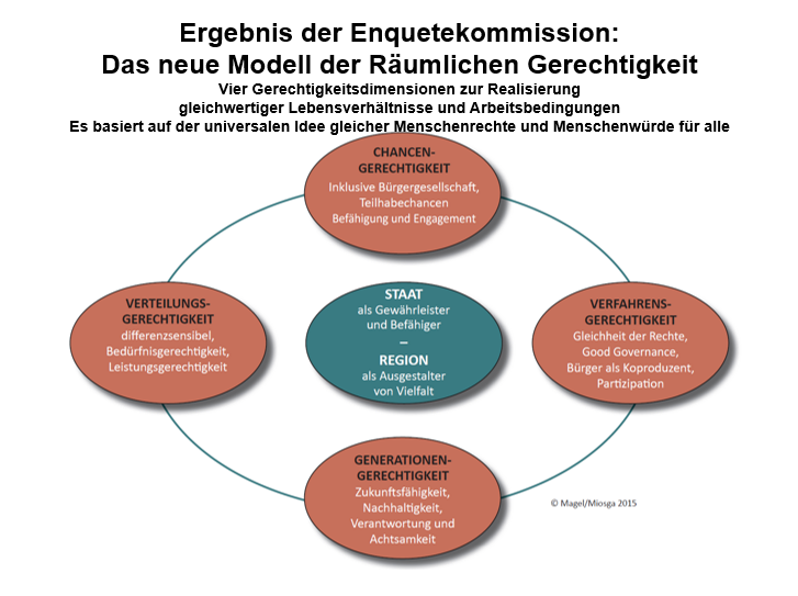 Natürlich entspricht die Teilfortschreibung des LEP – das Wort Teil sagt es ja schon – nicht den Forderungen nahezu aller Planungsexperten in Bayern nach einem völligen Neustart . In den Bündnissen „Wege zum besseren LEP“ und „Offener Appell für ein zukunftsfestes Bayern“ haben sich die besten und erfahrensten Köpfe Bayerns aus Architekten – und Ingenieurekammer Bau, Akademien Ländlicher Raum (ALR) , Städtebau und Landesplanung (DASL) , Raumforschung und Landesplanung (ARL) , dem Bund Deutscher Architekten (BDA) , Bund Deutscher Landschaftsarchitekten (BDLA) sowie aus Bayerischem Landesverein für Heimatpflege , Bund Naturschutz (BN) , CIPRA, Vereinigung für Stadt-, Regional- und Landesplanung (SRL) , dem Verband Beratender Ingenieure (VBI) und der Kath Landjugend zusammengeschlossen und leidenschaftlich innovativere Ideen und Vorgehensweisen wie z.B. regionale , partizipativ erarbeitete Raumbilder angemahnt und vor allem eine Planung von der Landschaft her , also von den begrenzten und begrenzenden natürlichen Ressourcen . Geholfen hat das alles nicht . Zu stark waren die Beharrungskräfte und – wie Stephan Reiß Schmidt , Vertreter der Initiative und der DASL bei der Landtagsanhörung kritisierte – der Wille zum „Weiter so“. Entsprechend konservativ hat die Staatsregierung ihre alte aus Sicht der Kritiker überholte , weil zu sektorale statt ganzheitlich verwobene LEP Struktur beibehalten , aber gleichwohl einige bemerkenswerte Akzente gesetzt. Am erfreulichsten sind die Einführung des in der Enquetekommission Gleichwertige Lebensbedingungen geborenen Begriffes Räumliche Gerechtigkeit (siehe Abbildung ) als ethisches Mandat und der vorsichtige Versuch , ihn inhaltlich auszudeuten. Hier darf und muss in Zukunft aber noch mehr kommen! Vor allem muss die räumliche Gerechtigkeit ein verbindliches Ziel werden wie die Gleichwertigen Lebens – und Arbeitsbedingungen in ganz Bayern . An sie mag allerdings die Staatsregierung nicht so recht glauben , denn warum schränkt sie das Ziel gleich wieder ein durch den Zusatz „ mit möglichst hoher Qualität“? Dieses offensichtliche Zugeständnis an sog. realistische Politik erlaubt damit leider auch ein allzu ehrgeizloses Anstreben der Gleichwertigkeit in Stadt und Land!
