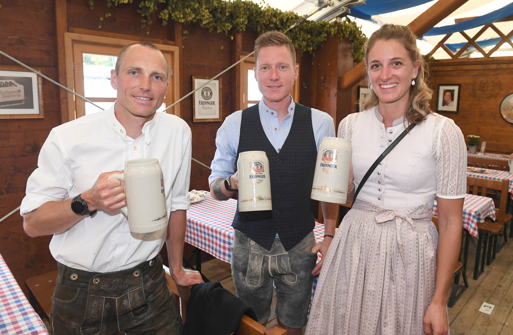 Erik Lesser, (l-r) Lukas Hofer und Vanessa Hinz sind auf dem Erdinger Herbstfest der Erdinger Alkoholfrei Profi Athleten zu sehen.