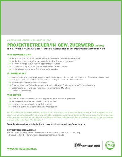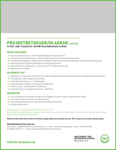 – Projektbetreuer/in Agrar (m/w/d) in Voll- oder Teilzeit für die MR-Geschäftsstelle in Prutting-Ried