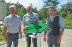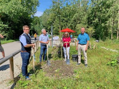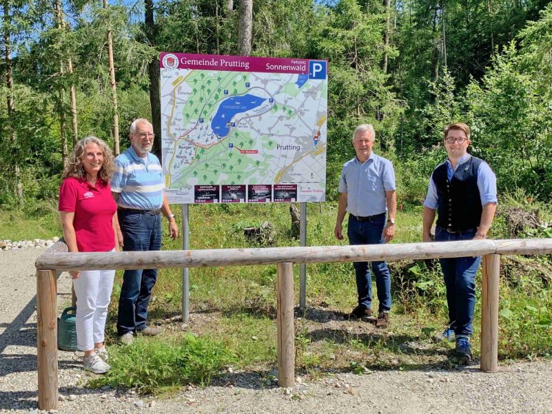 Gute Nachrichten für einheimische und auswärtige Besucher des Hofstätter Sees im Landkreis Rosenheim. In gemeinsamer Abstimmung haben sich die beiden See-Anlieger-Gemeinden Vogtareuth und Prutting zusammen mit dem Landratsamt Rosenheim um weitere Verbesserungen bemüht. Nach zuletzt erfolgten Parkplatz-Erweiterungen auf Vogtareuther Seite konnte nunmehr ein neuer Parkplatz „Am Sonnenwald“ an der Rosenheimer Straße und auf Pruttinger Gemeindegebiet eröffnet werden. Bei der Freigabe der gut zwei Dutzend kostenlos zur Verfügung stehenden neuen Parkplätze machten die Bürgermeister Johannes Thusbaß (Prutting) und Rudolf Leitmannstetter (Vogtareuth) besonders darauf aufmerksam, dass die Besucherparkplätze Teil eines Besucherlenkungs-Programmes sind. Zu diesem gehören auch die Übersichts- und Informationstafeln sowie die Neubeschilderung des Moorlehrpfades Burger Moos. Ein besonderer Dank der Bürgermeister galt für die Gestaltung der Tafeln und Karten Claus Linke aus Prien-Atzing, dessen ehrenamtlichen Tätigkeiten im Rahmen der Chiemseeagenda mit einem Erinnerungs-Wegweiser belohnt wurden. Ein weiteres „Vergelt´s Gott“ für die gute Zusammenarbeit gab es für  Herfried Stumpf, dem Leiter der Tiefbauverwaltung Landkreis Rosenheim. Gemeinsam mit Geschäftsführerin Christina Pfaffinger vom Tourismusverband Chiemsee-Alpenland pflanzten die Bürgermeister und Herr Stumpf eine Eberesche zur zusätzlichen Aufwertung des neuen Parkplatzes. Für Tourismuschefin Christina Pfaffinger sind die jüngsten Maßnahmen rund um den Hofstetter See überaus erfreulich, sie sagte dazu: „Die Parkmöglichkeiten sowie die Hinweis-Schilder tragen zu einem sanften, familienfreundlichen Tourismus in unserer Region bei“.