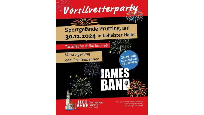 Am 30. Dezember findet auf dem Sportgelände Prutting eine Vorsilvesterparty in beheizter Halle statt, zu der die Gemeinde Prutting herzlich einlädt. Ab 20:30 Uhr ist Einlass (ab 16 Jahren).