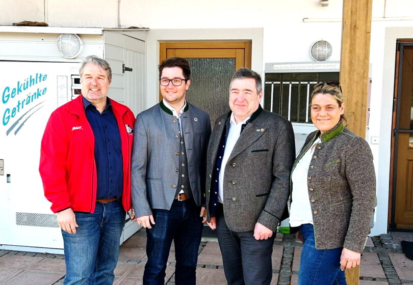 Bericht und Foto vor dem Vereinsheim: Frei Wähler – v.l: 1. Vorstand SV Prutting Markus Schäffner, Bürgermeister Johannes Thusbaß, Landtagsabgeordneter Josef Lausch, Bezirks- und Gemeinderätin Barbara Stein.