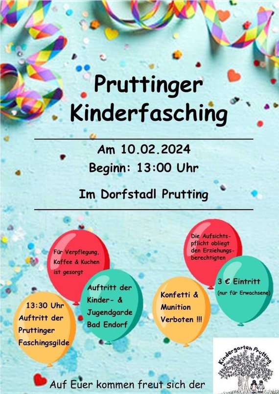 Am Samstag, 10. Februar lädt der Kindergarten von Prutting zum heurigen Pruttinger Kinderfasching ein. Beginn ist um 13 Uhr im Dorfstadl Prutting.