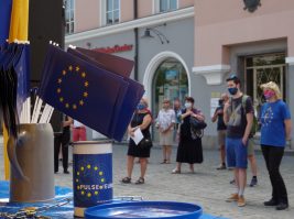 Mit einem kleinen Schauspiel um einen Grenzbaum machte das Team von Pulse of Europe deutlich, welche kuriosen aber vor allem schwierige Folgen es für viele Menschen hatte, dass Europa zu einem Flickenteppich der unterschiedlichsten Regelungen wurde. Manche durften zwar den Hund zu ihrer Familie auf der anderen Seite der Grenze schicken, nicht aber ihren Angehörigen zur Seite stehen. Für manche der 1,9 Millionen Menschen, die in der EU grenzüberschreitend arbeiten, gab es Sonderregelungen, viele andere mussten sich entscheiden, entweder bei ihrer Familie oder in ihrem Betrieb zu bleiben – und das für Monate.