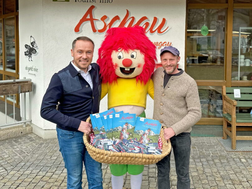Ein fröhliches “Hurra, Hurra, der Pumuckl ist wieder da” schallte nicht nur aus den Fernsehgeräten zu Beginn der neuen Episoden von Meister Eder und seinem schelmischen Kobold. Auch in Aschau freute man sich über die tatkräftige Unterstützung des neuen Meister Eders, Florian Brückner (rechts), und des frechen Pumuckls. Zusammen mit Aschaus Tourismuschef Herbert Reiter (links) wurden die glücklichen Gewinner der Gästekartenverlosung 2023 vor der Tourist Info ausgelost.
