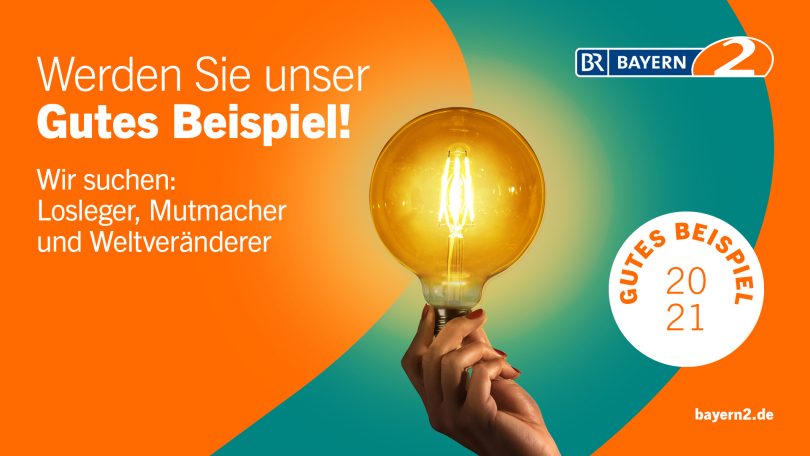 Losleger, Mutmacher und Weltveränderer gesucht: Beim Wettbewerb „Gutes Beispiel“ zeichnet Bayern 2, das Kultur- und Informationsradio des Bayerischen Rundfunks, Menschen aus, die etwas bewegen – egal ob mit ihrem Start-up, einem Projekt oder ehrenamtlich. Alle Engagierten aus Bayern, die sich für eine lebenswerte Gesellschaft einsetzen und durch ihr Handeln dazu beitragen, diese positiv zu verändern, können sich mit ihren Projekten bis 22. März 2021 unter bayern2.de/gutes-beispiel bewerben. Zu gewinnen gibt es Preisgelder in Höhe von insgesamt 10.000 Euro, gestiftet von einem Sponsor. Die Preisverleihung am 12. Mai 2021 wird ab 18.05 Uhr live auf Bayern 2 übertragen.