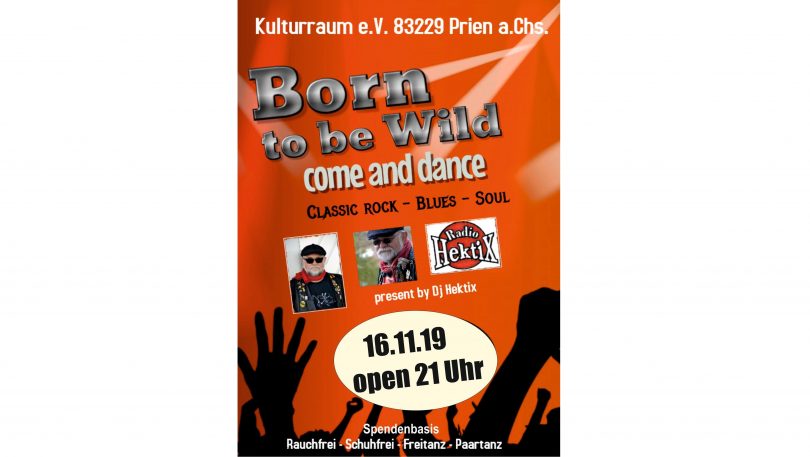 Am Samstag, den 16. November 2019, lädt Radio Hektix in den Priener Kulturraum zur Tanz- und Musikveranstaltung “Born to be Wild – come and dance” mit DJ Hektix ein. Dabei werden die Musikgenres Classic Rock, Blues und Soul bedient. Beginn der Veranstaltung ist um 21 Uhr.