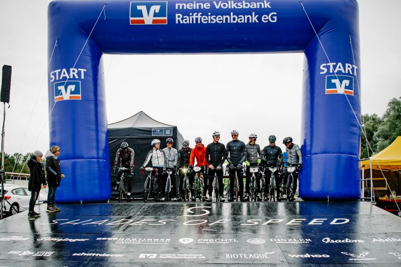 Marcus Burghardt hatte geladen und die Rennradfahrer kamen: Knapp über 1.000 Teilnehmer gingen am letzten Sonntag bei der Erstaustragung seines eigens organisierten Radmarathons „Shades of Speed“ an den Start. Darunter auch zahlreiche Prominente, unter anderem Profi-Rennfahrer André Greipel, einer der besten deutschen Sprinter im Straßen-Radsport, Biathlet Simon Schempp, der dreifache Olympiasieger Eric Frenzel und die Miss Germany 2019 ,Nadine Bernais. Die ersten verwegenen Rennradler rollten bereits in der Morgendämmerung die schwarze Startrampe auf dem Gelände von Auto Eder in Kolbermoor herunter. Auf fünf unterschiedlich langen, landschaftlich reizvollen und abwechslungsreichen Strecken, die längste davon 270 Kilometer, ging es für die Fahrer durch das östliche Rosenheimer Umland und das Chiemgau, bei der längsten Strecke bis zum Königsee. Eines der Strecken-Highlights, die monumentale Rossfeld-Panoramastraße, hatte man bereits am Vortag vorsorglich aus der Streckenführung gestrichen. „Bei diesem Wetter schlichtweg zu unsicher. Die Sicherheit der Teilnehmer hat für uns oberste Priorität.“, hieß es seitens des Veranstalters. Doch die schwierigen Wetterbedingungen schreckten die Teilnehmer kaum ab. In selbst gewählte Geschwindigkeits-Gruppen eingeteilt, radelten die Fahrer von Versorgungsstelle zu Versorgungsstelle, wo sie sich von den insgesamt knapp 80 freiwilligen Helfern – der Großteil von diesen kam aus dem mit Marcus Burghardt verbundenen WSV Samerberg – mit heißem Tee oder Kaffee, sowie vorzüglichem, warmen Essen, serviert von bekannten (Sterne)-Köchen wie Andreas Senn („Unterwirt“, Reit im Winkl und „Senns“, Salzburg), Achim Hack (Gut Steinbach, Reit im Winkl), Giuseppe Amici (Kunstmühle, Rosenheim) und Florian Lerche (Alpenrose, Samerberg) versorgen zu lassen.