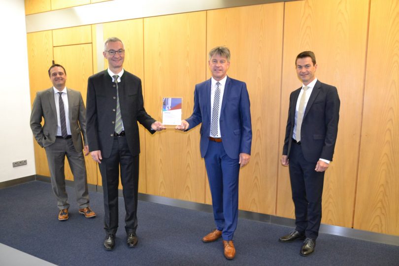 Bildunterschrift: Vertriebsvorstand Stephan Donderer (2.v.l.) übereicht Rainer Obertshauser (3. v.l.) die Auszeichnung. Es gratulieren Christian Matschina, Leiter GewerbekundenCenter Bad Aibling/Mangfalltal/Oberes Inntal (links) und Thomas Dobner, Gebietsdirektor Bad Aibling/Mangfalltal/Oberes Inntal (rechts).