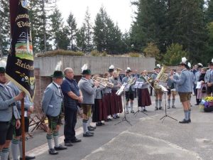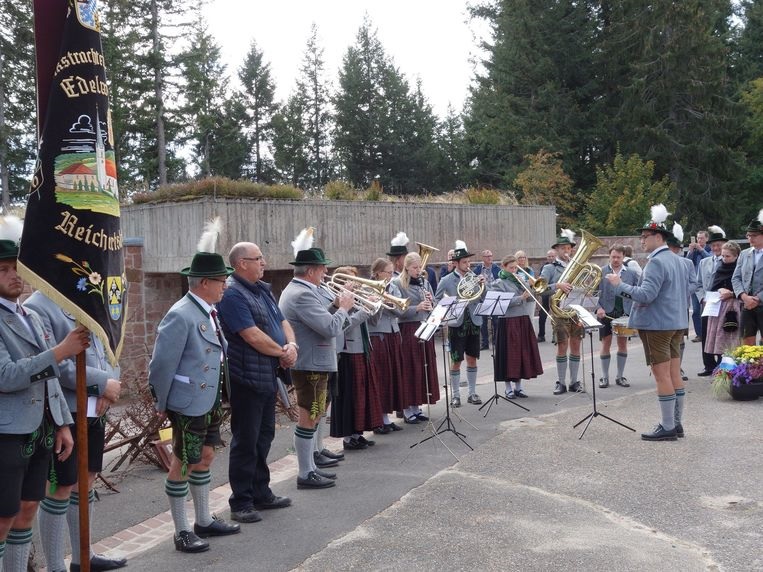 Auf dem Lingekopf in den Vogesen: Trachtler und Musik gedenken der hier gefallenen Soldaten. 3. von links und nicht in Tracht, General a.D. Dominique Muller, Vorsitzender des Vereins vom Lingekopf (Foto: Guillaumette Lauer, Barr)