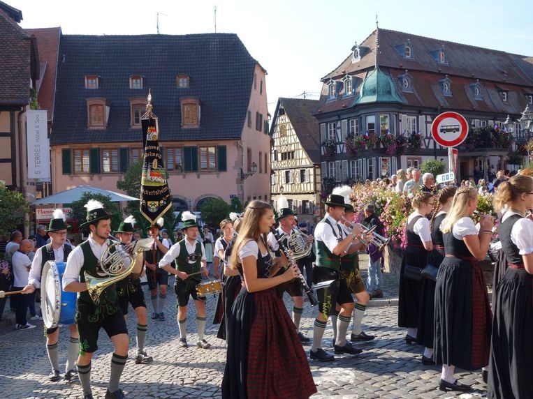 Trachtler und Musik marschieren am Sonntagmittag auf dem Rathausplatz von Barr auf.