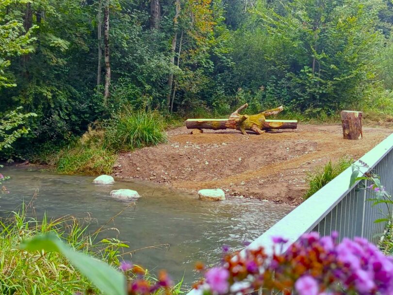 Am Ufer lädt ein Bankerl zum Verweilen ein, zurechtgesägt aus einer alten Eiche. An einen Baumstumpf lassen sich Fahrräder anlehnen. Aber er funktioniert ebenso gut als kleine Ablagefläche für die Brotzeit. Über eine abgeflachte Böschung führt der Weg hinunter ans Wasser. Wer möchte, kann bis zu einem der Sitzsteine waten, Platz nehmen und die Füße ins erfrischende Nass halten. Nach Erholung und Stärkung ist es dann Zeit, den Ausflug fortzusetzen.