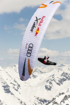 Nur 15 Minuten später kam Pinot auf italienischem Boden an. Der Franzose hatte am Ende doch deutlich Meter gelassen und war nicht ganz zufrieden. „Ich bin heute nicht so gut geflogen,“ sagte er. „Am Nachmittag wird es sicher besser. Lermoos wird heute noch schaffbar sein, wenn es keine Gewitter gibt. “Sein Supporter füllte in der Zwischenzeit Baguette und Kekse in die Taschen des Gleitschirms und der Athlet hob ab.