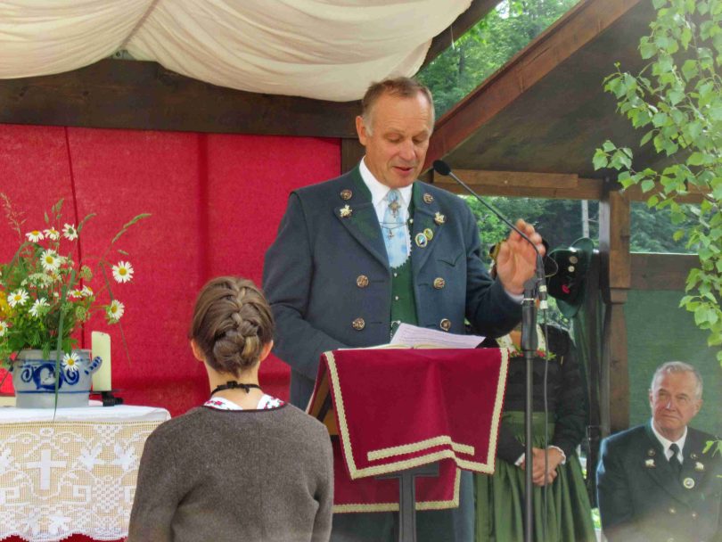 Liabe Wallfahrer, warum san mia heit überhaupt do? Mia haben uns verpflichtet oiwei am Himmefahrtstog an die Trachtler die im Kriag gfoin san zu gedenken und an Herrgott bitt ma um an Frieden. Oiwei und oiwei wieder an die schrecklichen Folgen eines Krieges zu erinnern, an die Opfer, an das Leid, is wichtig. Des derf ma net einfach obhackeln wia einen Einkaufszettel, zu erinnern und zu mahnen sand wir den Kriegsopfern schuldig. Wenn skrupellose Staatsführer, wia grod der russische Präsident, sein eigenes Volk ohliagt und Menschenrechte mit de Fiaß trett, do derf de Stimme des Volkes net verstummen.