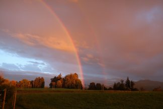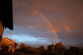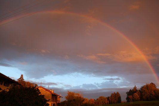 Irgendwo zwischen Aschau und Wildenwart stand er gestern der große Topf mit Gold, der für den Kundigen an der Stelle zu finden ist, wo der Regenbogen die Erde berührt. Ein gewaltiger Regenbogen spannte sich am Samstagabend zum Tag der Deutschen Einheit über dem Chiemgau, präsentierte den Himmel noch einmal von der schönsten Seite und spendierte den Menschen zwischen Aschau und Wildenwart einen wunderschönen doppelten Regenbogen. Während die Sonne den Chiemgau beleuchtete, brauste mit aller Macht der Föhnsturm beim Sonnenuntergang durchs Inntal und sorgte hier für einen klaren Himmel mit mächtigen Wolkengebirgen an den Grenzen.