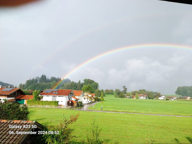 Unsere Aufnahme mit einem Regenbogen über dem Dorf Arbing entstand vom Nachbardorf Bachham aus.
